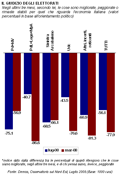 Questo tipo di configurazione, combinata agli orientamenti prevalenti nell'area, determina una certa risalita dei tre indici standard. Ciò corrisponde a scarti evidenti, rispetto ai "numeri" di marzo, soprattutto per quanto riguarda l'Italia: dati che, comunque, continuano a determinare un saldo d'opinione ben sotto l'asticella dello zero. La temperatura rilevata dal barometro economico dell'Osservatorio si mantiene infatti su valori siderali. Tanto più se confrontati con quelli dell'estate 2006: anche due anni fa all'insediamento di un nuovo governo - peraltro di centro-sinistra - era corrisposta una crescita dell'ottimismo economico, ma di entità ben superiore rispetto a quella attuale. Gli indici erano saliti, in quel periodo, ai massimi livelli: sebbene destinati ad un crollo repentino già a partire dall'autunno; sebbene, comunque, preceduti dal segno "meno". Nonostante l'iniezione di fiducia garantita dall'ingresso nell'era del quarto governo Berlusconi, il quadro economico nazionale continua dunque ad apparire critico ai cittadini di quest'area. Sei su dieci, nel campione interpellato, sostengono che le cose, nella penisola, sono peggiorate ulteriormente nel corso dell'ultimo trimestre. L'economia regionale continua ad esibire, agli occhi della popolazione locale, performance superiori: in questo caso, la maggioranza relativa del campione (il 45%) registra soprattutto indizi di stazionarietà. |