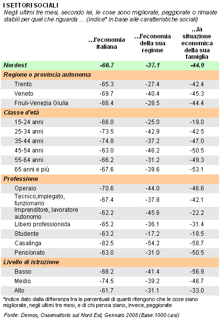 Pensionati, casalinghe ed operai; anziani e persone con basso livello d'istruzione: sono queste le aree sociali che esprimono maggiore disagio economico, nelle regioni nord-orientali. Il periodico sondaggio dell'Osservatorio sul Nord Est rileva, tra i cittadini e nelle famiglie, una forte preoccupazione per la tenuta dei conti familiari, cui si abbina il persistere di una visione decisamente negativa delle dinamiche nazionali e locali. Ma oggi come in passato, nel monitoraggio svolto da Demos per Il Gazzettino, il quadro italiano si presenta decisamente più critico rispetto a quello regionale. Non possiamo parlare di record negativo, ma poco ci manca. Il punto più basso, nelle valutazioni sulla congiuntura economica nazionale, è stato toccato nell'estate 2005, quando l'indice costruito da Demos è sceso a -73. Dopo una fase di veloce risalita, fermatasi a -26 (verso la metà del 2006), si è assistito, successivamente, ad un deciso peggioramento del "clima economico", che negli ultimi mesi ha fatto nuovamente precipitare gli indici economici. Del resto, il clima di incertezza politica e le ricorrenti "emergenze" nazionali - su tutte, quella dei rifiuti campani - non aiutano certo a "scommettere" sul sistema paese. E, mentre gli osservatori internazionali si spingono a parlare di un "declino italiano", lo scenario mondiale proietta nuove preoccupazioni sulla penisola. La crisi finanziaria internazionale, lo spettro della recessione Usa: temi che, in questi giorni, hanno dominato l'incontro del G7 a Tokyo. Non sorprende, quindi, che quasi tre persone su quattro abbiano osservato, negli ultimi tre mesi, un peggioramento dell'economia italiana, e che solo un esiguo 5% abbia percepito un trend di segno opposto. Il saldo fra questi due gruppi porta nuovamente il barometro dell'Osservatorio a far segnare una temperatura glaciale: -69. I risultati del sondaggio confermano come, puntando l'attenzione sul contesto locale, i cittadini rilevino un quadro più confortante. Nelle valutazioni sulla propria regione, l'indice si ferma a -37: un valore comunque ben sotto la soglia dello "zero", ma meno critico rispetto a quello riferito all'Italia; e comunque risalito di qualche punto rispetto al risultato dello scorso settembre (-45). Andando a distinguere le diverse realtà territoriali, in ogni caso, è possibile osservare come il dato più negativo riguardi il Veneto (-40), mentre il Friuli-V.G. e la provincia di Trento si fermano più di dieci punti più in alto (-27/-29). Il quadro rimane critico se, dalle percezioni generali, spostiamo il focus sulle valutazioni relative alle condizioni personali degli intervistati. Ma ancor più preoccupante è il fatto che, in questo caso, il dato rappresenta effettivamente il minimo storico, nel periodo di osservazione coperto dal monitoraggio di Demos. Quasi una persona su due, infatti, pensa che la situazione economica della propria famiglia, nell'ultimo trimestre, sia andata deteriorandosi (47%). Ad essere maggiormente colpite, in questo senso, sono soprattutto alcune categorie marginali della società: le persone più anziane e, in particolare, i pensionati (-51). Denunciano, inoltre, una situazione di difficoltà nella gestione del budget domestico le persone che hanno trascorso meno tempo sui banchi di scuola e, tra le categorie socio-economiche, le casalinghe (-59) e gli operai (-47). |