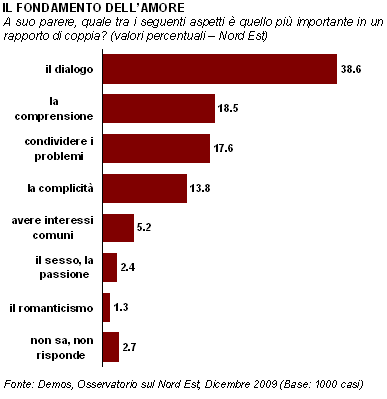 "Due non è il doppio, ma il contrario di uno, della sua solitudine. Due è alleanza, filo doppio che non è spezzato". Lo scrittore napoletano Erri De Luca esprime così la sua idea di coppia in "Il contrario di uno". L'Osservatorio sul Nord Est, curato da Demos per Il Gazzettino, oggi indaga sul campo dei sentimenti e dell'importanza di essere "in due" nella società contemporanea. La ritiene una condizione fondamentale la maggioranza assoluta dei rispondenti: 58%. Un intervistato su tre, invece, la considera importante, ma non basilare. L'aspetto maggiormente rilevante in questo campo sembra essere il dialogo (39%), seguito da comprensione (19%) e condivisione dei problemi (18%). Anche se, per un intervistato su tre, dialogo, comprensione e condivisione si fermano di fronte a lavatrice e asse da stiro, considerati soprattutto "cose da donne". La vita di coppia è uno dei fattori che trova maggiore rappresentazione e spazio nella società contemporanea. Giornali (scandalistici e non) si occupano costantemente della spesso turbolenta vita amorosa dei vip. Film e telefilm mettono in scena copioni raramente esenti da risvolti quantomeno teneri, se non romantici. Spesso suonano alla radio canzoni inneggianti alla passione per qualcuno appena incontrato o intrise di dolorosa nostalgia per chi si è perso. Ogni giorno le tv trasmettono talk show in cui imperano racconti di vita e reality che riprendono "amori in diretta". Per non parlare dei romanzi talvolta costruiti su storie di matrimoni spenti e accesi amanti. In un contesto come questo ci hanno in parte stupito i dati presentati oggi, soprattutto perché appaiono in controtendenza rispetto alla rappresentazione mediatica. Donne e uomini sono infatti uniti nel ritenere il rapporto di coppia fondamentale (58%) o importante (32%). Età e pratica religiosa ci offrono delle indicazioni interessanti: sono soprattutto i giovani con meno di 35 anni e quanti non frequentano i riti religiosi a ritenere importante -ma non basilare- la "vita a due", mentre coloro che tendono a considerare il rapporto di coppia fondamentale sono maggiormente presenti tra adulti, anziani e praticanti assidui. Anche le valutazioni sugli aspetti rilevanti della "vita a due" sono particolarmente interessanti: passione, sesso e romanticismo -tutti ingredienti fondamentali dell'amore "rappresentato" dai media- sono relegati in fondo alla classifica. Il richiamo alle difficoltà della quotidianità, al bisogno di sentirsi compresi, alla necessità di vedersi riconosciuti dalla persona che si ama appare chiaro. Infatti è il dialogo, scelto da quasi quattro rispondenti su dieci, ad essere il fattore maggiormente indicato. A seguire troviamo la comprensione (19%), la condivisione dei problemi (18%) e la complicità (14%). Una vita in due, dunque, basata su dialogo e condivisione. Che per alcuni, però, ha almeno un limite: le faccende domestiche. Un rispondente su tre, infatti, è d'accordo con l'affermazione "La cura della casa è soprattutto compito della donna". E anche in questo caso osserviamo una frattura generazionale: sono soprattutto quanti hanno più di 55 anni a sostenere questa opinione, mentre i più giovani si mostrano meno propensi a sostenere la distinzione di genere nelle faccende domestiche.