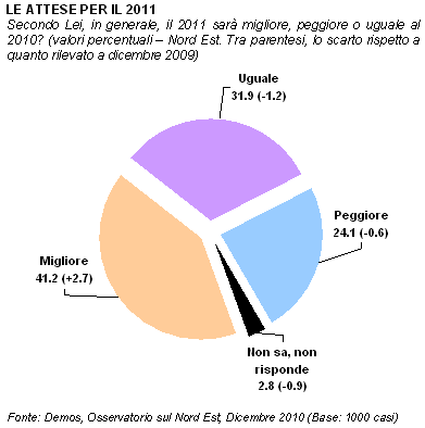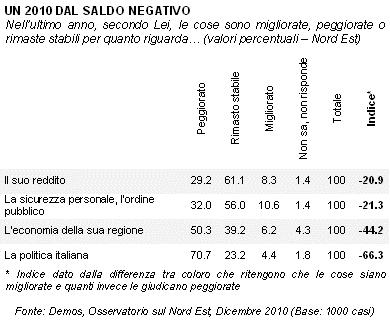 Speranza e incertezza: sembrano essere questi i sentimenti che caratterizzano lo sguardo dei nordestini verso il nuovo anno, mentre quello vecchio si chiude lasciandosi alle spalle giudizi negativi su più fronti. L'Osservatorio sul Nord Est, curato da Demos per Il Gazzettino, con l'avvicinarsi della notte di San Silvestro, indaga intorno ai giudizi sull'anno appena trascorso e sulle aspettative rispetto a quello che sta per arrivare. Il 2010 ha evidenziato delle criticità diffuse: rispetto al proprio reddito, all'ordine pubblico, all'economia regionale e, ancor di più, alla politica italiana. Ma le attese per il nuovo anno sono contrassegnate da un cauto ottimismo. Gli ultimi giorni di dicembre sembrano perfetti per fare bilanci, personali o sociali che siano. Si mettono in fila fatti e idee, esperienze e persone, li si differenzia con un segno positivo o negativo e si tirano le somme: ecco il saldo dell'anno. I dati raccolti da Demos mettono in luce una visione nettamente negativa dell'opinione pubblica riguardo ai dodici mesi appena trascorsi. Sia per quanto riguarda il reddito che la sicurezza personale, la maggioranza dei nordestini ritiene che nel corso del 2010 sia prevalsa la stabilità (rispettivamente: 61 e 56%), ma la differenza tra i giudizi positivi e quelli negativi restituisce un saldo dal segno meno per entrambi: -21. Per quanto riguarda l'economia della propria regione, invece, un nordestino su due ha percepito un peggioramento nel corso dell'ultimo anno, mentre è solo il 6% a dichiarare un miglioramento. L'indice sintetico, quindi, in questo caso scende fino a -44. Ma è per la politica italiana che i giudizi negativi dilagano: oltre sette nordestini su dieci la giudicano peggiorata nel corso del 2010, mentre circa il 4% esprime una valutazione positiva. L'indice sintetico, quindi, si inabissa fino a un preoccupato (e preoccupante) -66. Dal punto di vista dell'opinione pubblica dell'area, quindi, il 2010 è da porsi senz'altro nel novero degli anni molto difficili. Cosa aspettarsi dal futuro? Quasi un nordestino su tre (32%) ritiene che il nuovo anno sarà uguale a quello appena passato, mentre il 24% si attende un ulteriore peggioramento. La maggioranza relativa, però, crede che nel 2011 ci sarà un miglioramento (41%), e questo orientamento appare maggiormente diffuso tra i giovani con meno di 34 anni. Al contrario, a credere che il nuovo anno sarà uguale o peggiore rispetto a quello appena passato sono le classi d'età più adulte o anziane. I sentimenti con cui iniziare il nuovo anno appaiono (prudentemente) ottimisti. Speranza: secondo il 44% dei nordestini è questa la parola d'ordine che distingue lo sguardo verso il 2011. Ma anche incertezza (22%) e opportunità (9%), entusiasmo (7%) e paura (6%). La visione di ognuno, però, è influenzata da molti fattori, e uno dei più rilevanti è sicuramente la professione. Così, anche se la speranza appare un punto fermo per tutte le categorie considerate, osserviamo come lo sia in misura maggiore per operai, pensionati e casalinghe. Liberi professionisti e studenti, invece, mettono più degli altri l'accento sulle opportunità offerte dal nuovo anno e sull'entusiasmo con cui affrontarlo. Gli imprenditori e i lavoratori autonomi uniscono a questi due sentimenti anche l'incertezza.