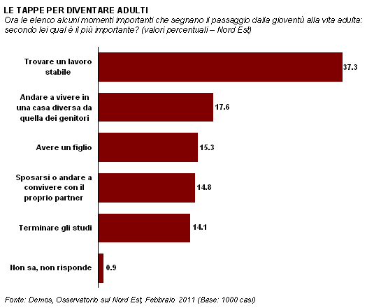 Qual è il momento che più di altri segna il passaggio dalla giovinezza all'età adulta? Trovare un lavoro stabile, prima di tutto: il 37% individua nella tranquillità professionale il momento in cui si chiude la giovinezza. Andare a vivere in una casa diversa da quella dei genitori, invece, è indicato dal 18% dei nordestini. A seguire troviamo altri due momenti che, in passato, erano considerati fondamentali per la fine della giovinezza: avere un figlio e sposarsi (o convivere) sono indicate da circa il 15% degli intervistati, mentre il termine degli studi si ferma al 14%.