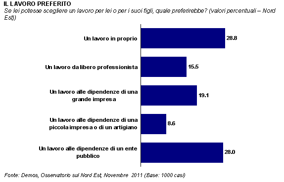 Il Nord Est torna a guardare al lavoro in proprio e a quello presso le grandi imprese, mentre sembra diminuire l'interesse per le libere professioni e per l'impiego presso gli enti pubblici. L'Osservatorio sul Nord Est, curato da Demos per Il Gazzettino, si occupa oggi del lavoro preferito dai nordestini. Il lavoro in proprio torna ad essere quello più scelto (29%), ma è seguito, a breve distanza, dall'impiego presso gli enti pubblici (28%). La grande impresa è preferita dal 19% dei nordestini intervistati, seguita dalla libera professione (poco più del 15%) e dal lavoro presso piccole imprese o artigiani (9%). Complessivamente, il saldo tra lavoro autonomo (44%) e dipendente (56%) continua ad essere nettamente a favore di quest'ultimo.