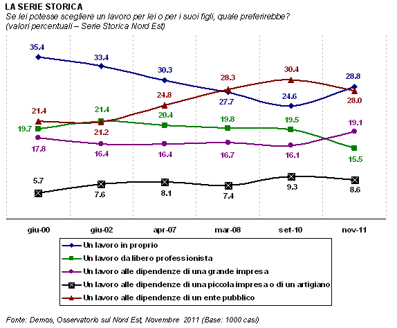 Consideriamo ora il trend del lavoro alle dipendenze di un ente pubblico: negli ultimi 10 anni avevamo assistito ad un aumento costante che lo aveva portato dal 21% del 2000 al 30% del 2010. Attualmente, invece, è indicato dal 28% dei nordestini, ed è tornato sui livelli del 2008. Le categorie sociali che guardano in misura maggiore al lavoro per gli enti pubblici sono quelle che tendono a cercare le maggiori sicurezze: anziani con oltre 65 anni di età, casalinghe e pensionati.
