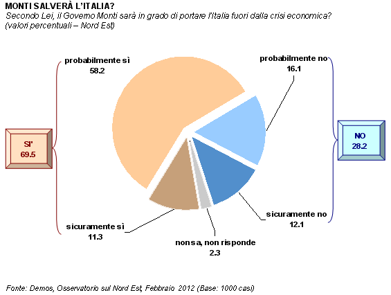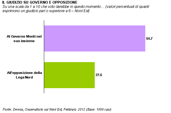 L'Osservatorio sul Nord Est è curato da Demos & Pi per Il Gazzettino. Il sondaggio è stato condotto nei giorni 6-8 febbraio 2012 e le interviste sono state realizzate con tecnica CATI (Computer Assisted Telephone Interviewing) da Demetra. Il campione, di 1039 persone (rifiuti/sostituzioni: 2828), è statisticamente rappresentativo della popolazione, con 15 anni e più, in possesso di telefono fisso, residente in Veneto, in Friuli-Venezia Giulia e nella Provincia di Trento, per area geografica, sesso e fasce d'età (margine massimo di errore 3,03%). I dati fino al 2007 fanno riferimento solamente al Veneto e al Friuli-Venezia Giulia. Natascia Porcellato, con la collaborazione di Fabio Turato, ha curato la parte metodologica, organizzativa e l'analisi dei dati. Beatrice Bartoli ha svolto la supervisione dell'indagine CATI. Lorenzo Bernardi ha fornito consulenza sugli aspetti metodologici. L'Osservatorio sul Nord Est è diretto da Ilvo Diamanti. Documento completo su www.sondaggipoliticoelettorali.it
