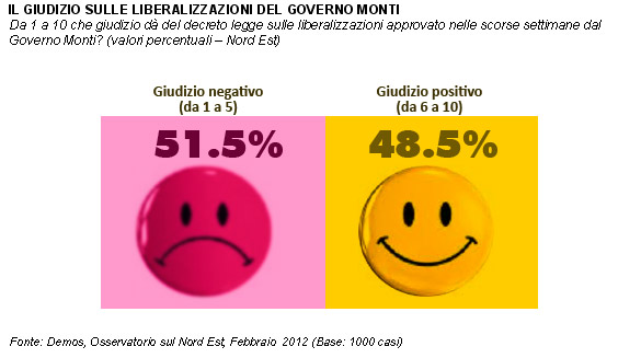 Il 49% dei rispondenti esprime un giudizio positivo sul decreto liberalizzazioni, e le categorie in cui più di altre è presente questo orientamento sono impiegati, liberi professionisti, studenti e disoccupati. Politicamente, invece, questa riforma viene vista con favore dalla maggioranza degli elettori di tutti i partiti che al momento sostengono il governo Monti (Udc, Pd, Idv, Pdl), oltre che dai simpatizzanti di Sel.