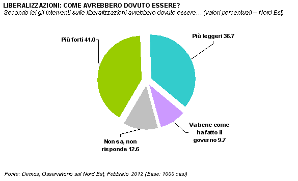 Nordestini divisi sul fronte liberalizzazioni: è il 49% ad esprimere un giudizio positivo (da 6 a 10) sulle aperture promosse dall'attuale governo, mentre il 51% si pronuncia negativamente. L'Osservatorio sul Nord Est, curato da Demosper Il Gazzettino, vede oggi in primo piano il giudizio dei cittadini dell'area sulle liberalizzazioni promosse dal governo Monti. Oltre al giudizio su quello che si sta facendo, la divisione attraversa anche quello che si sarebbe dovuto fare: il 41% avrebbe voluto interventi più incisivi, mentre il 37% mutamenti più leggeri. Le categorie più colpite sono, a giudizio dei nordestini, autotrasportatori (28%) e taxisti (20%).