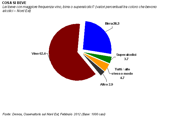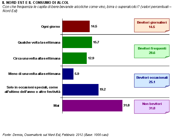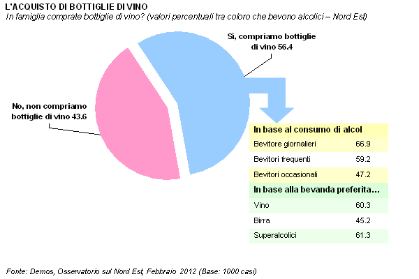 L'Osservatorio sul Nord Est, curato da Demos per Il Gazzettino, si occupa oggi del consumo di alcolici, dedicando uno spazio specifico all'acquisto di bottiglie di vino. Coloro che bevono alcolici ogni giorno sono il 15%, mentre ad avere un consumo almeno settimanale è poco meno del 29%. Un nordestino su quattro, poi, assume alcol solo occasionalmente, mentre non beve il 32%. Il vino appare il più amato (62%), lasciando a distanza birra (26%) e superalcolici (4%). L'acquisto di bottiglie di vino riguarda circa il 56% dei bevitori, e la maggioranza di loro predilige l'acquisto in cantina. I criteri per scegliere la bottiglia vedono in primo piano il tipo di vino (39%), ma anche una etichetta già nota semplifica la scelta (27%).