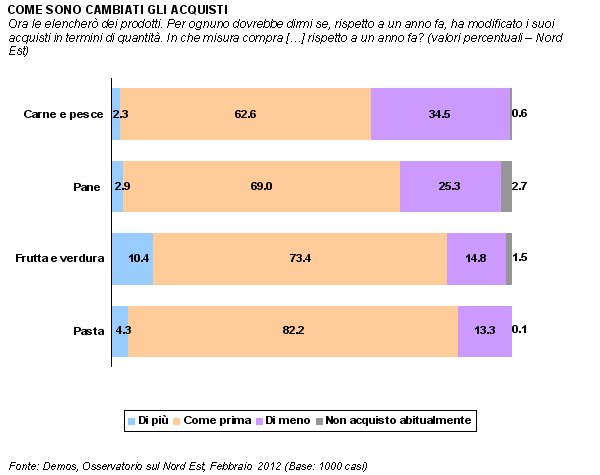 Crisi economica e nuove abitudini alimentari: queste sono due lenti attraverso cui è possibile leggere i dati relativi al consumo di alimenti primari. Da una parte, infatti, gli ultimi anni sono stati caratterizzati da una forte crisi economica che ha progressivamente ridotto la capacità di acquisto delle famiglie. Dall'altra, però, non possiamo dimenticare come alcune indicazioni di dietologi e ricercatori per una nutrizione più sana abbiano promosso l'assunzione di alcuni alimenti piuttosto che altri, orientando molte persone a modificare il proprio stile alimentare. Per questo, basta pensare alle campagne di informazione che negli ultimi anni hanno cercato di favorire il consumo di frutta e verdura. Pur considerando che quello alimentare è un comportamento dalle molteplici dimensioni e che, quindi, può essere osservato da diversi punti di vista, vediamo come, nell'ultimo anno, siano cambiati gli stili di consumo dei generi primari dei nordestini.