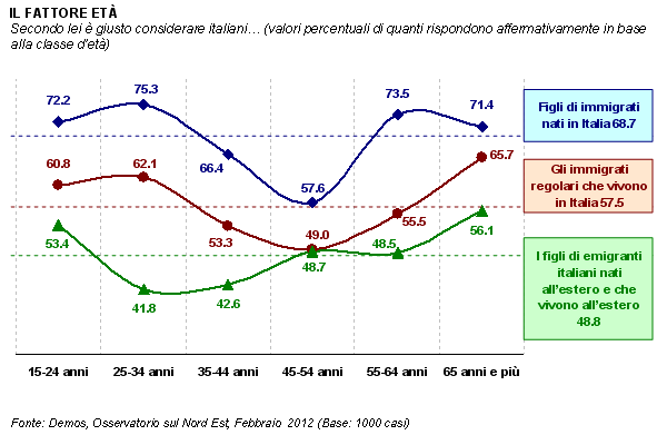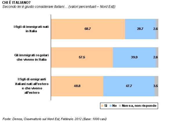 La legge sulla cittadinanza in vigore in Italia è basata sul «diritto di sangue» e, in linea generale, prevede che siano italiani i figli di italiani. Gli stranieri possono diventare italiani o sposando un italiano o attraverso la naturalizzazione (che possono chiedere dopo 10 anni di residenza ininterrotta in Italia). I figli degli immigrati nati in Italia, invece, possono fare domanda al compimento del 18° anno e devono dimostrare di aver vissuto nel Paese fino ad allora. Procedure lunghe e complesse, dunque. A fronte dello spirito espresso dalla legge, possiamo dire che nel Nord Est c'è un orientamento diverso, che tende a privilegiare i "nuovi italiani" rispetto a chi, di italiano, può vantare soprattutto, se non solo, l'origine. Sono quasi 7 nordestini su dieci, infatti, a ritenere italiani i figli di immigrati nati in Italia, mentre gli immigrati regolari che vivono nel nostro paese sono considerati connazionali dal 58%. Meno di un nordestino su due (49%), invece, giudica italiani i figli di emigranti italiani nati e residenti all'estero.