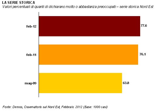 L'Osservatorio sul Nord Est è curato da Demos & Pi per Il Gazzettino. Il sondaggio è stato condotto nei giorni 6-8 febbraio 2012 e le interviste sono state realizzate con tecnica CATI (Computer Assisted Telephone Interviewing) da Demetra. Il campione, di 1039 persone (rifiuti/sostituzioni: 2828), è statisticamente rappresentativo della popolazione, con 15 anni e più, in possesso di telefono fisso, residente in Veneto, in Friuli-Venezia Giulia e nella Provincia di Trento, per area geografica, sesso e fasce d'età (margine massimo di errore 3,03%). I dati fino al 2007 fanno riferimento solamente al Veneto e al Friuli-Venezia Giulia. Natascia Porcellato, con la collaborazione di Fabio Turato, ha curato la parte metodologica, organizzativa e l'analisi dei dati. Beatrice Bartoli ha svolto la supervisione dell'indagine CATI. Lorenzo Bernardi ha fornito consulenza sugli aspetti metodologici. L'Osservatorio sul Nord Est è diretto da Ilvo Diamanti. Documento completo su www.agcom.it.