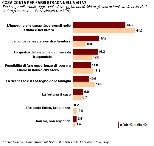 L'Osservatorio sul Nord Est, curato da Demos per Il Gazzettino, si occupa oggi delle condizioni che permettono ai giovani di "farsi strada" nella vita. Il 35% degli intervistati ritiene che siano impegno e capacità personali nello studio o nel lavoro ad essere determinanti. Al secondo posto troviamo le conoscenze personali e familiari (17%), seguite dalla qualità dell'istruzione (16%). La possibilità di fare esperienze all'estero riscuote l'interesse del 12% degli intervistati, mentre l'11% guarda alle ricchezze familiari. Il 7%, infine, affida il successo al caso. Rileviamo come, rispetto a due anni fa, perdano importanza l'impegno e le capacità personali e la ricchezza familiare (rispettivamente: -6 e -4 punti percentuali), mentre aumentano il loro peso la qualità delle scuole frequentate e, soprattutto, le conoscenze personali e familiari (+4 e +8 punti percentuali).