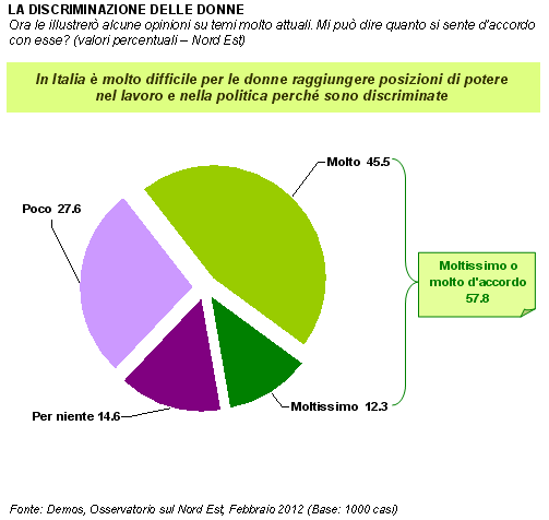 La discriminazione che frena la carriera delle donne appare una consapevolezza piuttosto diffusa: il 58% degli intervistati ritiene che "In Italia è molto difficile per le donne raggiungere posizioni di potere nel lavoro e nella politica perché sono discriminate". Inoltre, come per il WEF, anche per i nordestini non sembra essere cambiata la situazione: la quota, infatti, appare sostanzialmente identica a quella dell'anno scorso. Tra le donne, però, questa consapevolezza appare più diffusa (64%), mentre gli uomini sembrano meno propensi ad ammetterla (52%).