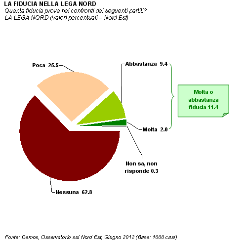L'Osservatorio sul Nord Est è curato da Demos & Pi per Il Gazzettino. Il sondaggio è stato condotto nei giorni 31 maggio-4 giugno 2012 e le interviste sono state realizzate con tecnica CATI (Computer Assisted Telephone Interviewing) da Demetra. Il campione, di 1008 persone (rifiuti/sostituzioni: 3615), è statisticamente rappresentativo della popolazione, con 15 anni e più, in possesso di telefono fisso, residente in Veneto, in Friuli-Venezia Giulia e nella Provincia di Trento, per area geografica, sesso e fasce d'età (margine massimo di errore 3,08%). I dati fino al 2007 fanno riferimento solamente al Veneto e al Friuli-Venezia Giulia. Natascia Porcellato, con la collaborazione di Fabio Turato, ha curato la parte metodologica, organizzativa e l'analisi dei dati. Mauro Vullo ha svolto la supervisione dell'indagine CATI. Lorenzo Bernardi ha fornito consulenza sugli aspetti metodologici. L'Osservatorio sul Nord Est è diretto da Ilvo Diamanti. Documento completo su www.sondaggipoliticoelettorali.it.