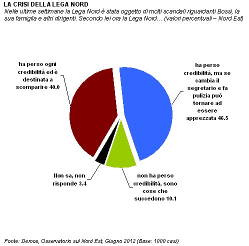 La crisi della Lega Nord non è solo la crisi di un partito, ma può trasformarsi nella crisi di un sistema di rappresentanza che si era consolidato nel corso degli ultimi 10 anni. In questo arco di tempo, infatti, da una parte abbiamo assistito all'ascesa elettorale del Carroccio, che è salito, nel Nord Est, dal 9% (2001) al 22% (2008), per limitarci alle sole Elezioni politiche. Dall'altro lato, poi, la Lega è riuscita a imporre una vasta rete di amministratori locali: presidenti di regione e di provincia, sindaci e consiglieri. Una presenza tanto diffusa da suggerire cautela nel decretare la fine di un partito che in passato ha già mostrato di saper uscire dalle difficoltà e re-inventare.