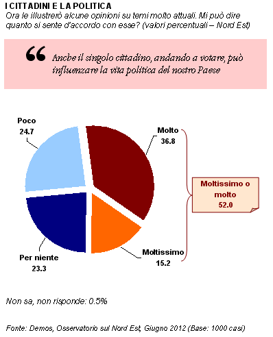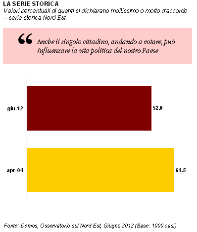 L'Osservatorio sul Nord Est è curato da Demos & Pi per Il Gazzettino. Il sondaggio è stato condotto nei giorni 31 maggio-4 giugno 2012 e le interviste sono state realizzate con tecnica CATI (Computer Assisted Telephone Interviewing) da Demetra. Il campione, di 1008 persone (rifiuti/sostituzioni: 3615), è statisticamente rappresentativo della popolazione, con 15 anni e più, in possesso di telefono fisso, residente in Veneto, in Friuli-Venezia Giulia e nella Provincia di Trento, per area geografica, sesso e fasce d'età (margine massimo di errore 3,08%). I dati fino al 2007 fanno riferimento solamente al Veneto e al Friuli-Venezia Giulia. Natascia Porcellato, con la collaborazione di Fabio Turato, ha curato la parte metodologica, organizzativa e l'analisi dei dati. Mauro Vullo ha svolto la supervisione dell'indagine CATI. Lorenzo Bernardi ha fornito consulenza sugli aspetti metodologici. L'Osservatorio sul Nord Est è diretto da Ilvo Diamanti. Documento completo su www.agcom.it.