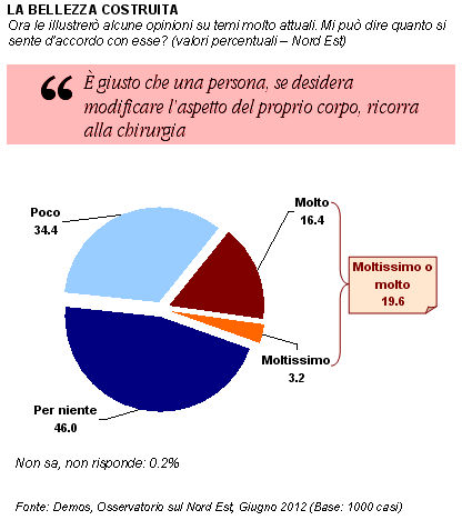 Recentemente, in Italia è entrata in vigore parte della normativa che pone nuove linee-guida per la chirurgia estetica (L. 86 del 05.06.2012). Elenco degli specialisti autorizzati ad operare, registri degli impianti delle protesi mammarie, divieto di intervento sui minori: sono tanti e diversi i fronti su cui interviene questa legge. Una particolare attenzione, però, sembra essere riservata agli interventi che più interessano le donne: quelli al seno. D'altra parte, il fenomeno delle protesi mammarie appare di dimensioni importanti: in Italia ogni anno si contano circa 80-85mila impianti. Tre interventi su dieci sono ricostruzioni conseguenti ad un intervento (ad esempio, dopo la rimozione di un tumore alla mammella), mentre i rimanenti sette sono riconducibili a ragioni estetiche (dati Società Italiana di Chirurgia Plastica, Ricostruttiva ed Estetica - Sicpre). Come si pone l'opinione pubblica nordestina di fronte al tema degli interventi di chirurgia estetica?