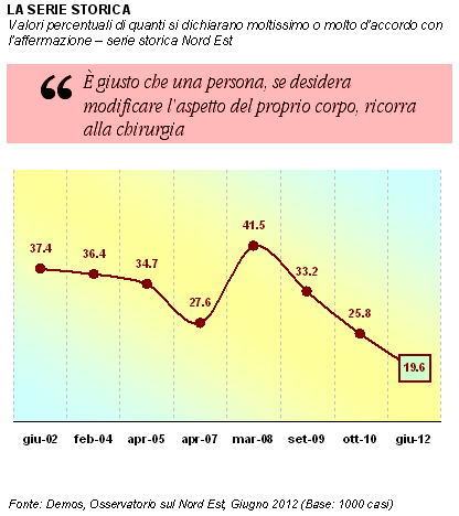 In Veneto, Friuli-Venezia Giulia e nella provincia autonoma di Trento, l'appeal dell'intervento estetico sembra essere in calo. Oggi, è un rispondente su cinque a ritenere giusto che una persona ricorra alla chirurgia per modificare il proprio aspetto. Guardando alla serie storica, possiamo identificare due fasi: la prima, tra il 2002 e il 2007, in cui l'apprezzamento verso questa posizione scende lentamente dal 37% al 28%. Un improvviso aumento, invece, è stato rilevato nel 2008, quando il consenso intorno al "ritocchino" è salito al 41%. Da quel momento, però, ricomincia una lenta discesa: 33% nel 2009, 26% l'anno successivo, fino all'attuale minimo storico: 20%.