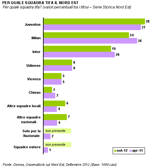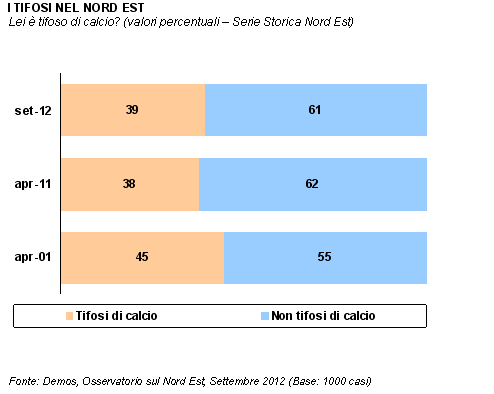 Sarà anche per queste ripetute inchieste, ma il numero di tifosi di calcio nel Nord Est appare in calo: oggi è il 39% a dichiarare di tifare per una squadra, quota sostanzialmente analoga a quella registrata lo scorso anno. Nel 2001, però, i tifosi erano il 45%: la contrazione, nell'arco del decennio, è di circa 6 punti percentuali. La Juventus (28%) si conferma come la squadra più amata, seguita da Milan (24%) e Inter (19%). A seguire, poi, troviamo Udinese (8%, ma in Friuli-Venezia Giulia il tifo per la squadra di Guidolin sale al 41%), Vicenza (5%) e Chievo (2%).