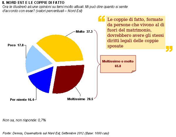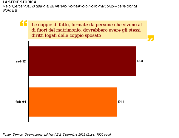 A Nord Est la consapevolezza di un cambiamento nei rapporti di coppia sta aumentando in modo sempre più marcato: pare essere questa la principale indicazione che emerge dai dati presentati oggi dall'Osservatorio sul Nord Est, curato da Demos per Il Gazzettino. L'ultima rilevazione indica come il 66% degli intervistati si dichiari molto o moltissimo d'accordo con il riconoscimento degli stessi diritti legali fra le coppie di fatto, formate da persone che vivono al di fuori del matrimonio, e le coppie sposate. L'opinione espressa dai nordestini risulta in crescita rispetto al 2004, quando già il 54% si dichiarava favorevole all'equiparazione.