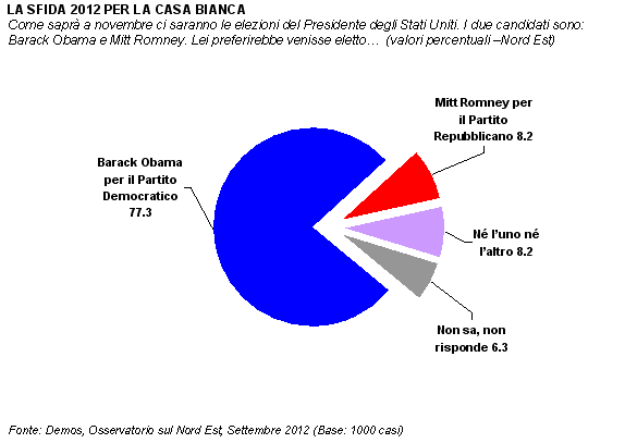 Dopo mesi di campagna elettorale il gran giorno è arrivato ed entro poche ore conosceremo il nome del nuovo Presidente degli Stati Uniti. L'Osservatorio sul Nord Est, curato da Demos per Il Gazzettino, si occupa oggi delle elezioni americane. A Nord Est l'opinione in proposito risulta molto chiara: più di tre nordestini su quattro (77%) preferisce l'elezione alla Casa Bianca del democratico Barack Obama e solo l'8% degli intervistati sceglie il repubblicano Mitt Romney. L'analisi della serie storica conferma come il Presidente in carica risulti gradito in misura crescente. A pochi giorni dall'elezione del 2008, Obama era preferito dal 66% dei nordestini, mentre oggi lo indica il 77%. Al contrario, il repubblicano Romney è apprezzato ancor meno di John McCain: l'antagonista di Barack Obama nel 2008, infatti, raggiungeva il 13% delle preferenze, mentre oggi Mitt Romney si ferma all'8%.