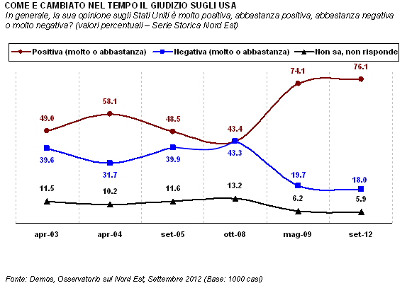 Più in generale, se in passato il gradimento espresso dai nordestini nei confronti degli Stati Uniti era altalenante, dal 2008 è decisamente aumentato chi esprime un giudizio molto o abbastanza positivo. Infatti, a Nord Est l'apprezzamento verso gli Stati Uniti passa dal 43% nel 2008 al 74% nel 2009, con un balzo di ben 31 punti percentuali, fino a raggiungere il 76% nel 2012.