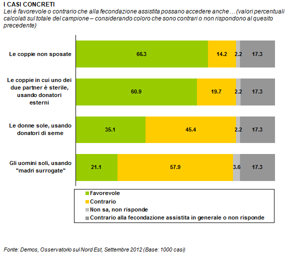 L'orientamento generale dei nordestini verso la fecondazione assistita è positivo: oltre 8 intervistati su 10 la considerano favorevolmente. Indagando i casi specifici, però, vediamo come ci siano diverse gradazioni di accordo. Le coppie - siano esse non sposate oppure composte da un partner sterile - dovrebbero poter accedere alla fecondazione assistita per oltre il 60% degli intervistati. Diverso, invece, il discorso per quanti non sono in coppia. La maternità attraverso tecniche mediche di una donna sola è vista con favore dal 35% dei nordestini, mentre per un uomo single la quota si riduce ulteriormente a circa il 21%.