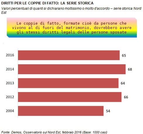Secondo i dati elaborati da Demos per Il Gazzettino, il 65% degli intervistati ritiene che "Le coppie di fatto dovrebbero avere gli stessi diritti legali delle persone sposate". Guardando alla serie storica, possiamo vedere che il sostegno al riconoscimento di uno status giuridico ai conviventi era fermo al 54% nel 2004. In tutte le indagini successive, però, i valori oscillano tra il 64 e il 68%, segno di una sostanziale stabilità dell'orientamento presso l'opinione pubblica.