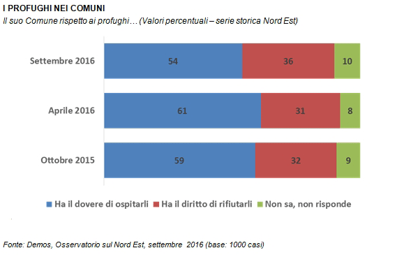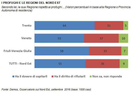 Dal 2015 ad oggi, le diverse rilevazioni che si sono succedute hanno indicato come la maggioranza degli intervistati (variamente compresa tra il 54 e il 61%) riconosca il dovere dell'accoglienza da parte della propria Regione, mentre il diritto al rifiuto viene riconosciuto da una minoranza variabile tra il 31 e il 37%. Anche guardando all'interno del Nord Est, si confermano le medesime tendenze. Il consenso verso l'accoglienza raggiunge il 64% in provincia di Trento, il 58% in Friuli-Venezia Giulia e il 53% in Veneto. Coloro che invece ritengono sia un diritto dei territori rifiutarsi di ospitare i profughi si fermano, rispettivamente, al 31% (Trento), 35% (Friuli-Venezia Giulia) e 37% (Veneto).