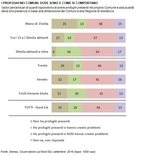 Il Governo ha recentemente dichiarato che ai comuni che accolgono profughi sarà garantito un maggior sostegno da parte dello Stato. L'obiettivo è di incentivare "l'accoglienza diffusa", una formula che permette di distribuire i richiedenti asilo sul territorio in proporzione agli abitanti, evitando le grandi concentrazioni. Nel Nord Est, le fiaccolate e le proteste hanno trasmesso l'idea di un territorio chiuso e riottoso ad accettare l'accoglienza diffusa, ma i dati raccolti da Demos in questi due anni sembrano mettere in discussione questa immagine.
