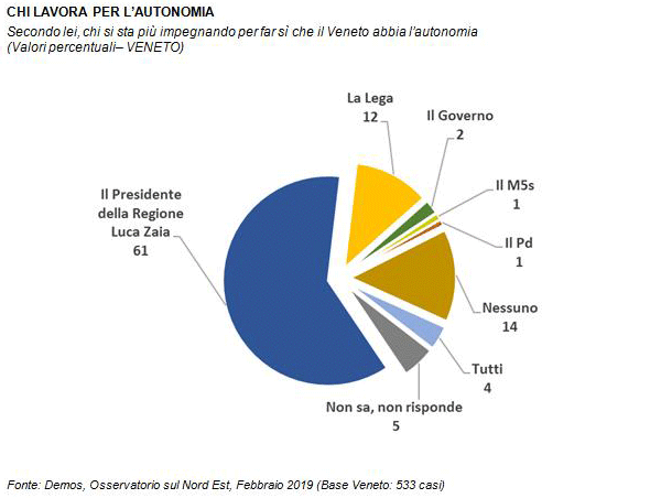 Se l'opinione pubblica ha ancora forti dubbi sulla reale possibilità che lo Stato conceda al Veneto l'autonomia, più chiaro sembra essere chi si sta impegnando di più per averla. Non il Pd (1%) o il M5s (1%). Non il Governo (2%) e poco (12%) la Lega. L'autonomia, se arriverà, quando arriverà, secondo "il popolo del Veneto" avrà un unico nome - e cognome. Quello del Governatore: Luca Zaia (61%).