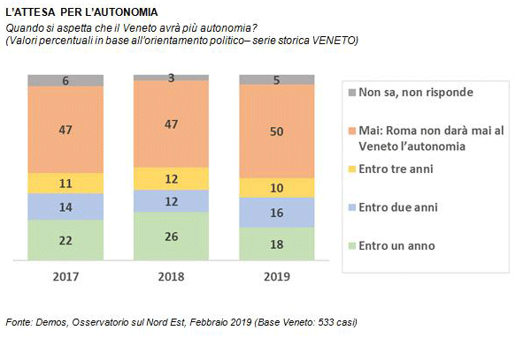 Secondo l'Osservatorio sul Nord Est curato da Demos, infatti, un intervistato su due (50%) pensa che Roma non concederà mai l'autonomia alla Regione. Il valore segna un aumento (+3 punti percentuali) sia rispetto al 2018 che guardando al 2017. I più ottimisti, che immaginano un Veneto autonomo entro un anno, oggi sono al minimo: 18%. Otto punti in meno rispetto al valore registrato l'anno scorso (26%) e quattro in meno se consideriamo il 22% di due anni fa. Poco più di un veneto su quattro (26%), invece, ritiene l'orizzonte sia di almeno altri 2 o 3 anni, e dal 2017 ad oggi la quota è stabile.