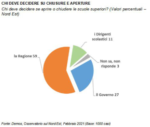 Chi deve decidere se aprire o chiudere le scuole superiori? La scelta, secondo i nordestini, deve rimanere in mano alle Regioni (59%), mentre il 27% preferirebbe fosse centralizzata a livello governativo e una minoranza (11%) vorrebbe che a decidere fossero i dirigenti scolastici.
