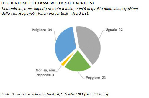 Oggi, 2021 d.C., qual è la qualità della classe politica del Nord Est rispetto a quella del resto d'Italia? Secondo le analisi di Demos per Il Gazzettino, il 34% dei nordestini la ritiene migliore, mentre il 42% non ravvisa differenze particolari. A ritenerla peggiore, invece, è il 21%.