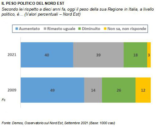 L'Osservatorio sul Nord Est è curato da Demos & Pi per Il Gazzettino. Il sondaggio è stato condotto tra il 1 e il 4 settembre 2021 e le interviste sono state realizzate con tecnica CATI, CAMI, CAWI da Demetra. Il campione, di 1000 persone (rifiuti/sostituzioni: 2118), è statisticamente rappresentativo della popolazione con 18 anni e più residente in Veneto, in Friuli-Venezia Giulia e nella Provincia di Trento, per provincia (distinguendo tra comuni capoluogo e non), sesso e fasce d'età (margine massimo di errore 3,1% con CAWI) ed è stato ponderato, oltre che per le variabili di campionamento, in base al titolo di studio. I dati fino al 2007 fanno riferimento solamente al Veneto e al Friuli-Venezia Giulia. I dati sono arrotondati all'unità e questo può portare ad avere un totale diverso da 100. I dati fino a febbraio 2019 fanno riferimento ad una popolazione di 15 anni e più. Natascia Porcellato, con la collaborazione di Ludovico Gardani, ha curato la parte metodologica, organizzativa e l'analisi dei dati. Marco Fornea ha svolto la supervisione della rilevazione effettuata da Demetra. L'Osservatorio sul Nord Est è diretto da Ilvo Diamanti.