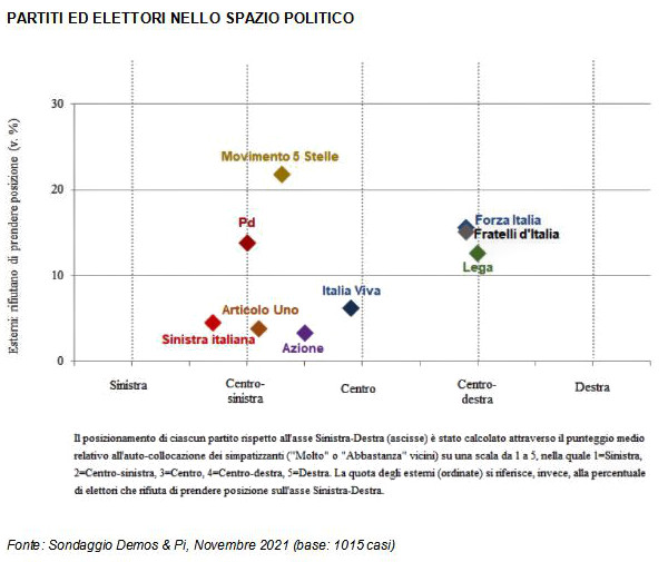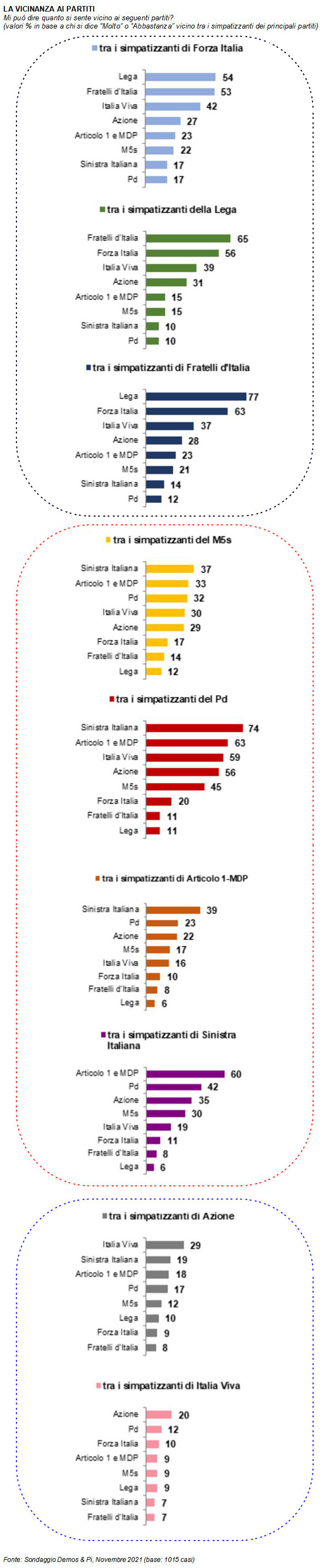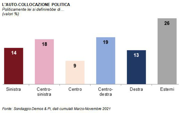 Il sondaggio è stato realizzato da Demos & Pi per La Repubblica. La rilevazione è stata condotta nei giorni 8-10 novembre 2021 da Demetra con metodo mixed mode (Cati - Cami - Cawi). Il campione nazionale intervistato (N=1.015, rifiuti/sostituzioni/inviti: 10.237) è rappresentativo per i caratteri socio-demografici e la distribuzione territoriale della popolazione italiana di età superiore ai 18 anni (margine di errore 3.1%). I dati sono arrotondati all'unità e questo può portare ad avere un totale diverso da 100.