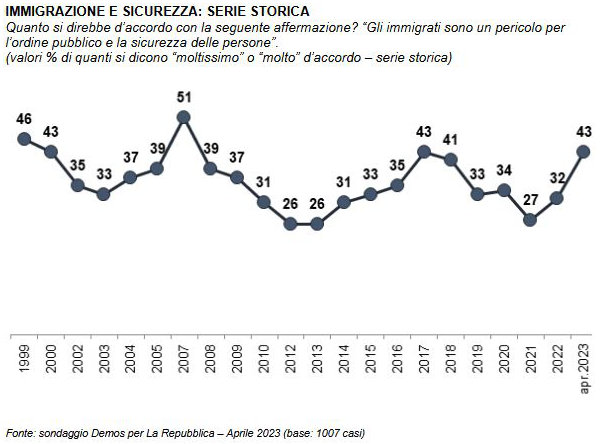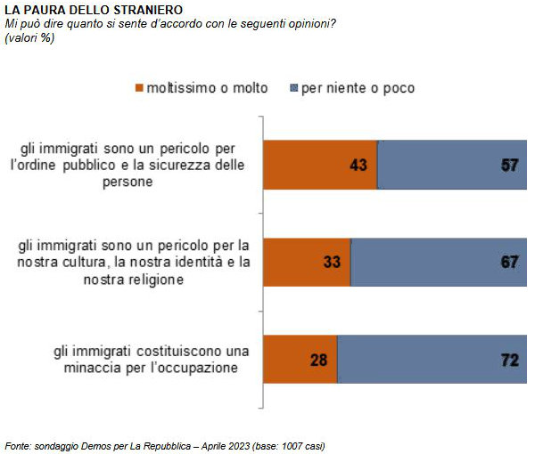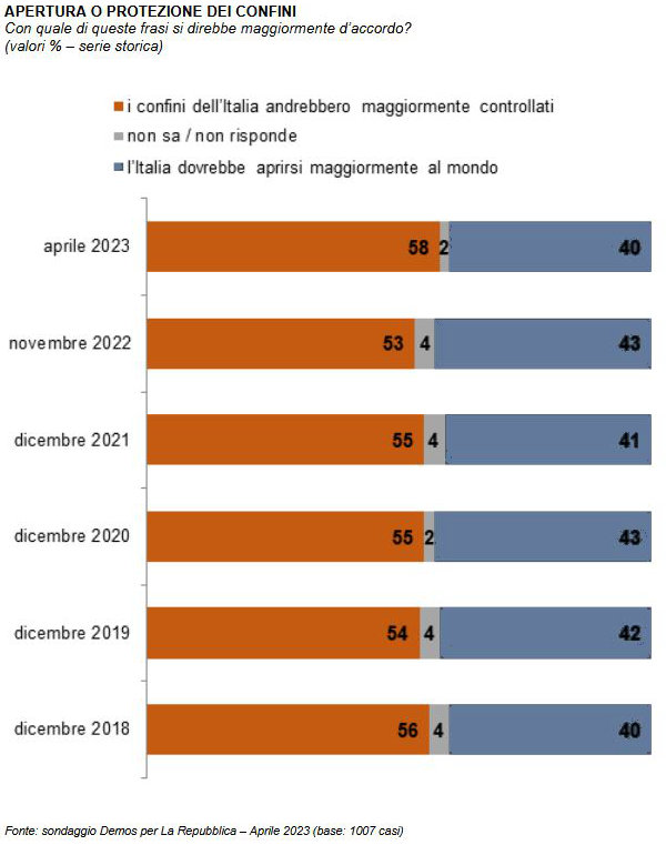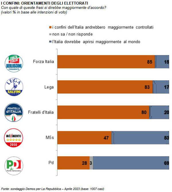 Il sondaggio è stato realizzato da Demos & Pi per La Repubblica. La rilevazione è stata condotta nei giorni 26-27 aprile 2023 da Demetra con metodo mixed mode (Cati - Cami - Cawi). Il campione nazionale intervistato (N=1.007, rifiuti/sostituzioni/inviti: 4.712) è rappresentativo per i caratteri socio-demografici e la distribuzione territoriale della popolazione italiana di età superiore ai 18 anni (margine di errore 3.1%).