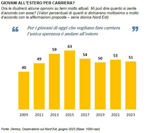 "Per i giovani di oggi che vogliano fare carriera l'unica speranza è andare all'estero"? Sì, secondo la maggioranza (51%) degli intervistati da Demos per l'Osservatorio sul Nord Est del Gazzettino. Ma come è cambiata nel tempo tale percezione? Quattordici anni fa, era il 40% a aderire a questa prospettiva di futuro di emigrazione per i giovani, ma già nel 2011 l'indicatore sfiorava la maggioranza assoluta (49%). È tra il 2013 e il 2015, però, che vengono raggiunti i valori più alti (rispettivamente: 59 e 63%). Nel 2017, quando la quota di consenso si attesta al 54%, sembra in parte rientrare il sentimento, ma al contempo si stabilizza: da allora, infatti, il valore oscilla tra il 50% del 2019, il 53% del 2021, fino all'attuale 51%.