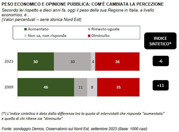 L'Osservatorio sul Nord Est è curato da Demos & Pi per Il Gazzettino. Il sondaggio è stato condotto tra il 4 e l'8 settembre 2023 e le interviste sono state realizzate con tecnica CATI, CAMI, CAWI da Demetra. Il campione, di 1006 persone (rifiuti/sostituzioni: 4331), è statisticamente rappresentativo della popolazione con 18 anni e più residente in Veneto, in Friuli-Venezia Giulia e nella Provincia di Trento, per provincia (distinguendo tra comuni capoluogo e non), sesso e fasce d'età (margine massimo di errore 3,09% con CAWI) ed è stato ponderato, oltre che per le variabili di campionamento, in base al titolo di studio. I dati fino al 2007 fanno riferimento solamente al Veneto e al Friuli-Venezia Giulia. I dati sono arrotondati all'unità e questo può portare ad avere un totale diverso da 100. I dati fino a febbraio 2019 fanno riferimento ad una popolazione di 15 anni e più. Natascia Porcellato, con la collaborazione di Ludovico Gardani, ha curato la parte metodologica, organizzativa e l'analisi dei dati. Marco Fornea ha svolto la supervisione della rilevazione effettuata da Demetra. L'Osservatorio sul Nord Est è diretto da Ilvo Diamanti.