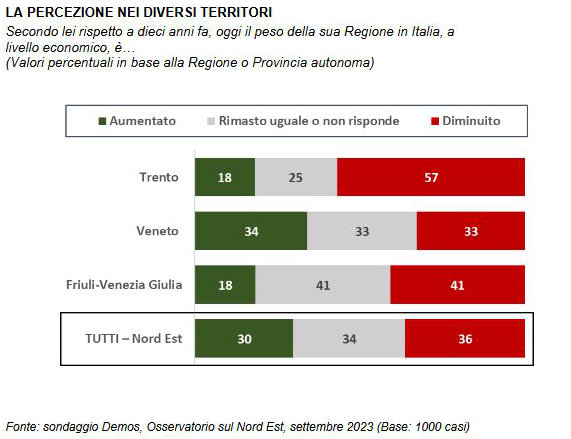 Come variano questi valori nei diversi territori che compongono il Nord Est? In Veneto, gli intervistati si dividono in tre componenti quasi equivalenti: il 34% giudica il peso della propria Regione accresciuto, il 33% invariato e il 33% lo vede come declinante. In provincia di Trento, invece, si fa marcata, e maggioritaria, l'idea che sia diminuita la propria rilevanza economica (57%), mentre in Friuli-Venezia Giulia appare più presente sia la componente che ritiene sia rimasto tutto uguale, sia quella che percepisce una perdita di centralità (entrambe 41%).