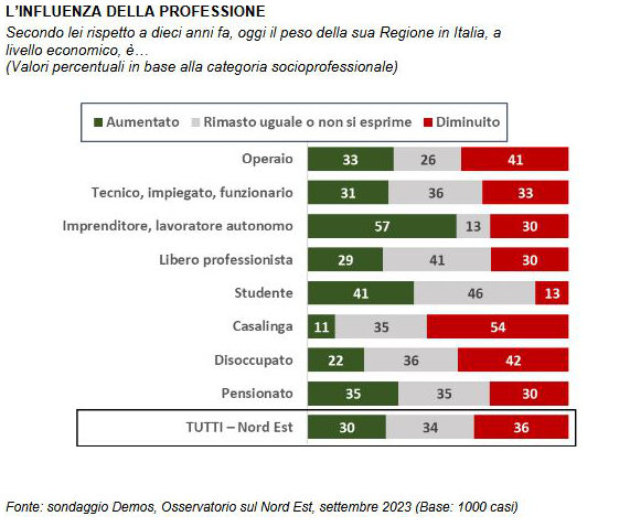 Veniamo, infine, alla percezione che hanno le categorie socioprofessionali. L'idea che il peso economico dell'area nell'ultimo decennio sia diminuito appare più presente tra gli operai (41%) e i disoccupati (42%), anche se il valore più ampio è osservabile tra le casalinghe (54%). Tra i liberi professionisti, invece, sembra essere maggiormente consistente la componente che giudica invariato questo fattore (41%), mentre gli studenti affiancano all'idea che non sia cambiato granché (46%), una percezione di crescita di importanza (41%). A schierarsi in misura maggiore a favore di un aumento di rilevanza del peso economico delle tre Regioni nordestine in Italia nell'ultimo decennio, invece, sono i pensionati (35%) e, in misura ancora più marcata, gli imprenditori e i lavoratori autonomi: qui, il valore supera la soglia della maggioranza assoluta, raggiungendo il 57%.