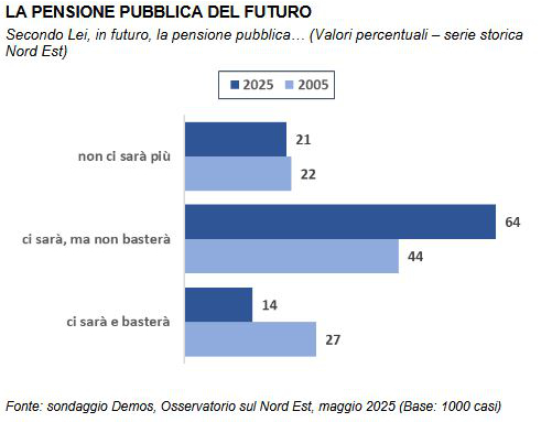 A che punto siamo con questi temi in Veneto, Friuli-Venezia Giulia e in Provincia di Trento? Guardando ai dati dell’Osservatorio sul Nord Est di Demos, vediamo che, tra gli intervistati, è largamente presente la convinzione che in futuro la pensione pubblica o non ci sarà più (21%) o non sarà adeguata (64%), mentre è solo il 14% a pensare che l’assegno erogato dall’INPS sarà sufficiente. Rispetto al 2005, i valori odierni mostrano una piccola rivoluzione culturale: la convinzione che la pensione pubblica sarà soddisfacente, infatti, si è dimezzata (dal 27 al 14%), mentre è cresciuta di 20 punti percentuali (dal 44 al 64%) la quota di quanti prevedono sarà insufficiente.