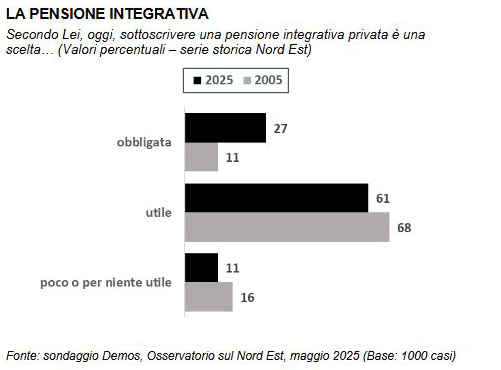 Ma è la pensione integrativa la risposta? La percentuale di chi la ritiene una scelta poco o per niente utile si ferma all’11%, mentre il 61% la ritiene funzionale e il 27% arriva a definirla una strada obbligata. Se è vero che non sembra ancora essere del tutto diffusa la consapevolezza della necessità della pensione integrativa, è altrettanto vero che, guardando al 2005, si può apprezzare un certo cambiamento culturale. In questi vent’anni, infatti, ad essere cresciuta, passando dall’11 al 27% (+16 punti percentuali) è proprio la componente di chi ritiene indispensabile la pensione integrativa.