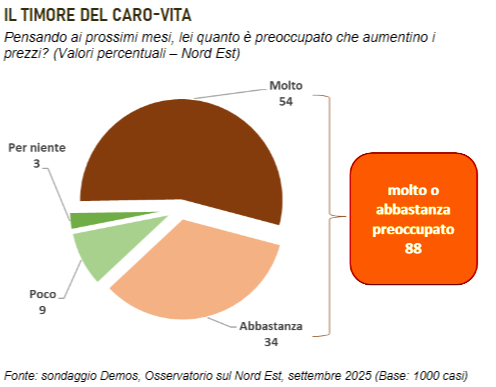 Timore caro-prezzi in primo piano in Veneto, Friuli-Venezia Giulia e provincia autonoma di Trento: secondo le analisi di Demos per l’Osservatorio sul Nord Est del Gazzettino, infatti, oltre un rispondente su due (54%) si dichiara molto preoccupato che nei prossimi mesi aumenti il costo della vita, e più di uno su tre (34%) esprime un tasso di inquietudine appena più tiepido. Nel complesso, dunque, l’ansia derivante dalla crescita del costo della vita arriva all’88%.