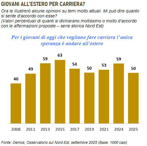 “Per i giovani di oggi che vogliono fare carriera l’unica speranza è andare all’estero”? Guardando alle analisi di Demos per Il Gazzettino, il tema sembra particolarmente divisivo per l’opinione pubblica dell’area. Oggi, infatti, è il 50% degli intervistati a condividere l’opinione proposta, ma guardando alla serie storica di cui dispone l’Osservatorio sul Nord Est possiamo vedere come questo orientamento sia cambiato nel corso degli ultimi 17 anni. Nel 2008, l’adesione all’idea che per i giovani desiderosi di fare carriera sia necessario emigrare in un Paese straniero si attestava al 40%, ma già tre anni più tardi la percentuale sfiorava la maggioranza assoluta (49%). Questa soglia sarà (ampiamente, 59%) superata nel 2013, e, in misura ancora più evidente, nel 2015, quando la condivisione arriva alla cifra record del 63%. Per contestualizzare meglio questi valori, vale la pena richiamare il periodo storico che stava attraversando l’Italia, alle prese con gli effetti della crisi economico-finanziaria mondiale innescata dal crollo di Lehman Brothers. Tra crisi del debito sovrano e spread sopra quota 500; le dimissioni di Silvio Berlusconi e la chiamata di Mario Monti a presiedere un Governo tecnico; il tessuto imprenditoriale in crisi e il movimento dei forconi; la disoccupazione e la sfiducia diffusa che faceva soffiare forte il vento dell’antipolitica e del populismo: è in queste condizioni, tra le più complicate della storia della Repubblica, che si basava la larghissima adesione all’idea che i giovani dovessero andarsene per avere un futuro. Tra il 2017 e il 2021, però, i valori sembrano raffreddarsi, assestandosi tra il 50 e il 54%, ma nel 2024 una nuova fiammata spinge l’adesione in alto, più vicina ai suoi primati (59%). Il valore odierno (50%), tuttavia, fa pensare che sia almeno in parte rientrata l’urgenza che si era manifestata solo un anno fa.