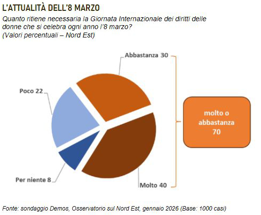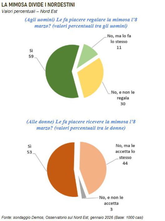 C’è un giorno all’anno in cui il Nord Est si riempie di giallo. La mimosa passa di mano in mano, profuma uffici e cucine, compare in post e messaggi. Ma, sotto quei rametti leggeri e delicati, si intravede qualcosa di molto più complesso: è, suo malgrado, il simbolo più visibile dell’otto marzo. Ma quanto è essenziale oggi questa ricorrenza? Secondo i dati analizzati da Demos per l’Osservatorio sul Nord Est del Gazzettino, sette intervistati su dieci la considerano molto (40%) o abbastanza (30%) necessaria. Questa larga maggioranza è del tutto trasversale ai settori sociali, ma appare piuttosto curioso come questa convinzione tenda a crescere più tra gli uomini (77%) che tra le donne (62%).