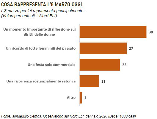 La differenza appare sottile, ma possiamo coglierla in maniera più precisa guardando alle diverse concezioni dell’otto marzo che ha l’opinione pubblica dell’area. In generale, il 38% dei nordestini la ritiene una ricorrenza importante per riflettere sui diritti delle donne, mentre per il 27% è preponderante la parte di ricordo delle lotte femminili del passato. Una quota tutt’altro che trascurabile, tuttavia, la vede come una festa meramente commerciale (23%), e a questa componente più “cinica” possiamo affiancare anche l’11% che la ritiene una ricorrenza ormai sostanzialmente retorica. In quali espressioni si distinguono maggiormente uomini e donne? Tra gli uomini appare più presente l’idea che l’otto marzo sia un importante momento di riflessione sui diritti delle donne (44%); tra le donne, invece, questa dimensione appare meno evidente (32%), mentre tende a farsi più consistente quella legata alla dimensione consumistica (28%). In sintesi, dunque, gli uomini sembrano vedere nell’otto marzo soprattutto un’occasione di riflessione, una data che serve e che va marcata. Le donne, pur riconoscendone l’importanza, mostrano un maggiore distacco unito al dubbio rispetto alla dimensione rituale o commerciale che si è fatta strada nel corso del tempo.