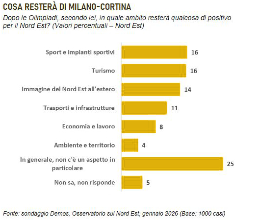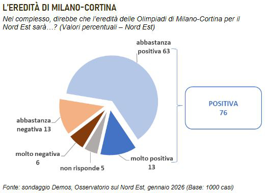 Domenica i riflettori saranno tutti puntati sul Cortina Curling Olympic Stadium, lo Stadio Olimpico del Ghiaccio di Cortina d’Ampezzo che ospiterà la cerimonia di chiusura Giochi Paralimpici, sugellando così l’intera avventura di Milano-Cortina 2026. Ma cosa rimarrà, al Nord Est, dopo questo evento? La larga maggioranza dell’opinione pubblica di Veneto, Friuli-Venezia Giulia e della Provincia autonoma di Trento valuta positivamente l’eredità delle Olimpiadi invernali di Milano-Cortina. Secondo i dati analizzati da Demos per l’Osservatorio sul Nord Est del Gazzettino, infatti, oltre tre intervistati su quattro (76%) ritengono che, per il territorio, l’impatto futuro dei Giochi che si sono tenuti in queste settimane sarà complessivamente molto (13%) o abbastanza (63%) positivo, mentre è una netta minoranza (19%) a ritenere che nei prossimi anni i riflessi saranno soprattutto negativi.